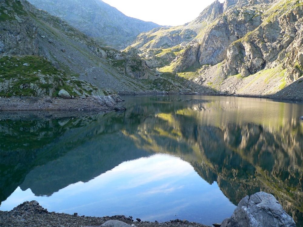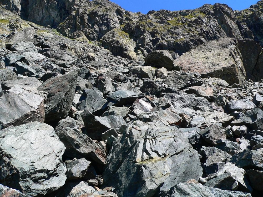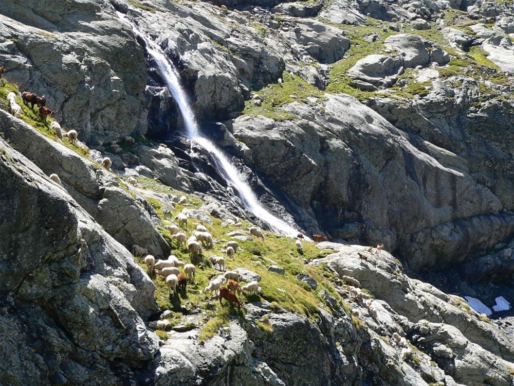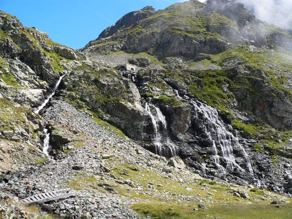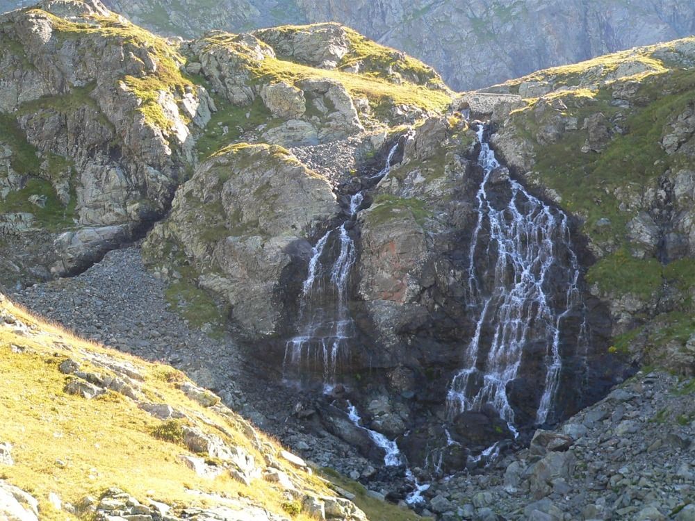 Du Col de la Pra, on monte en direction de la cascade sautant l’épaulement rocheux que l’on surmonte soit à gauche (marques blanches) par une succession de chaos de gros rochers et de pierriers.
