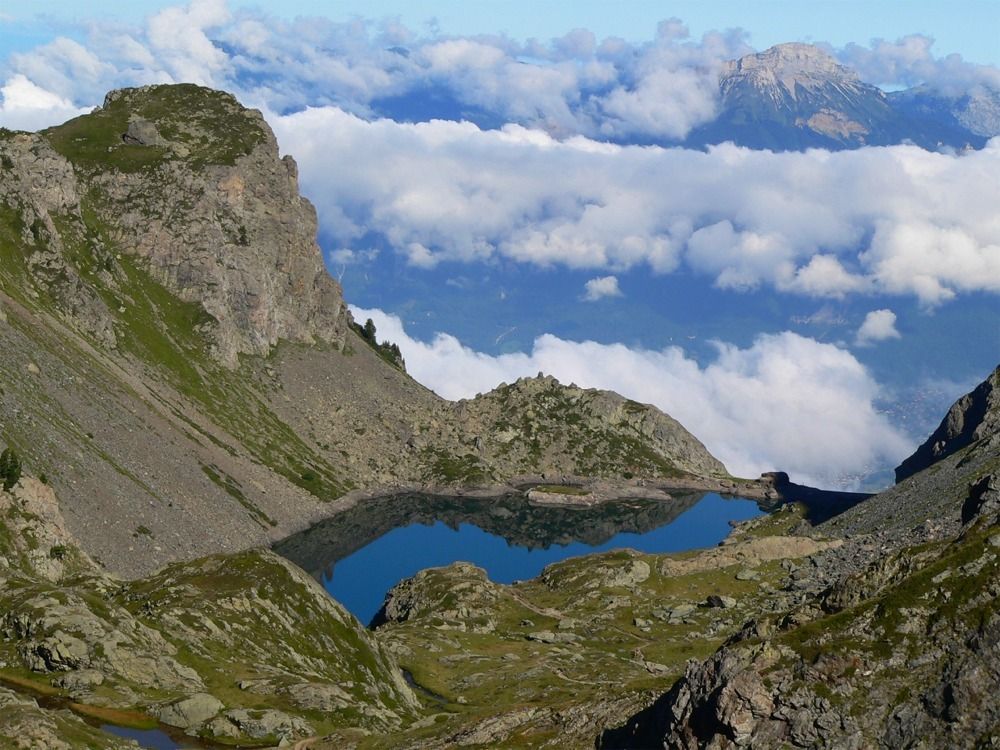 Le Lac du Petit Domènon (2.386 m) se découvre derrière un dernier verrou rocheux au pied de la face de la Grande Lance de Domène (2.790 m) qui se mire dans ses eaux turquoises.