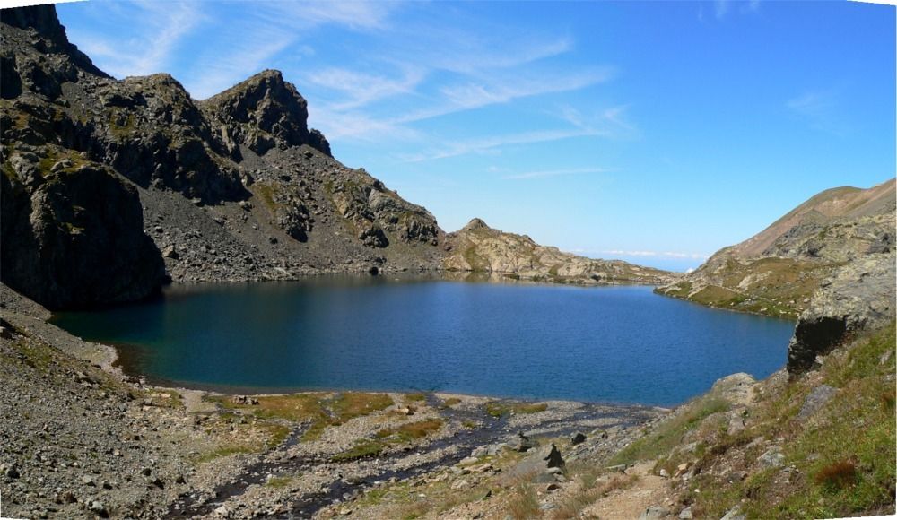 On continue sur la rive droite du lac pendant quelques minutes pour atteindre le Lac du Grand Domènon (2.385 m), jumeau du premier, bordé au par le Pic du Grand Domènon (2.802 m) et La Grande Lauzière (2.741 m).