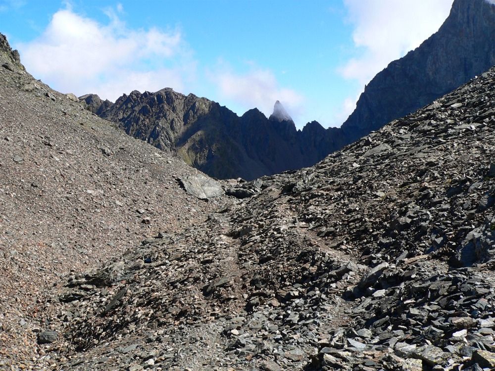 Continuer tout droit à vue en direction du Col de Freydane( 2645) que l'on atteint à travers une sente peu visible (ex GR).