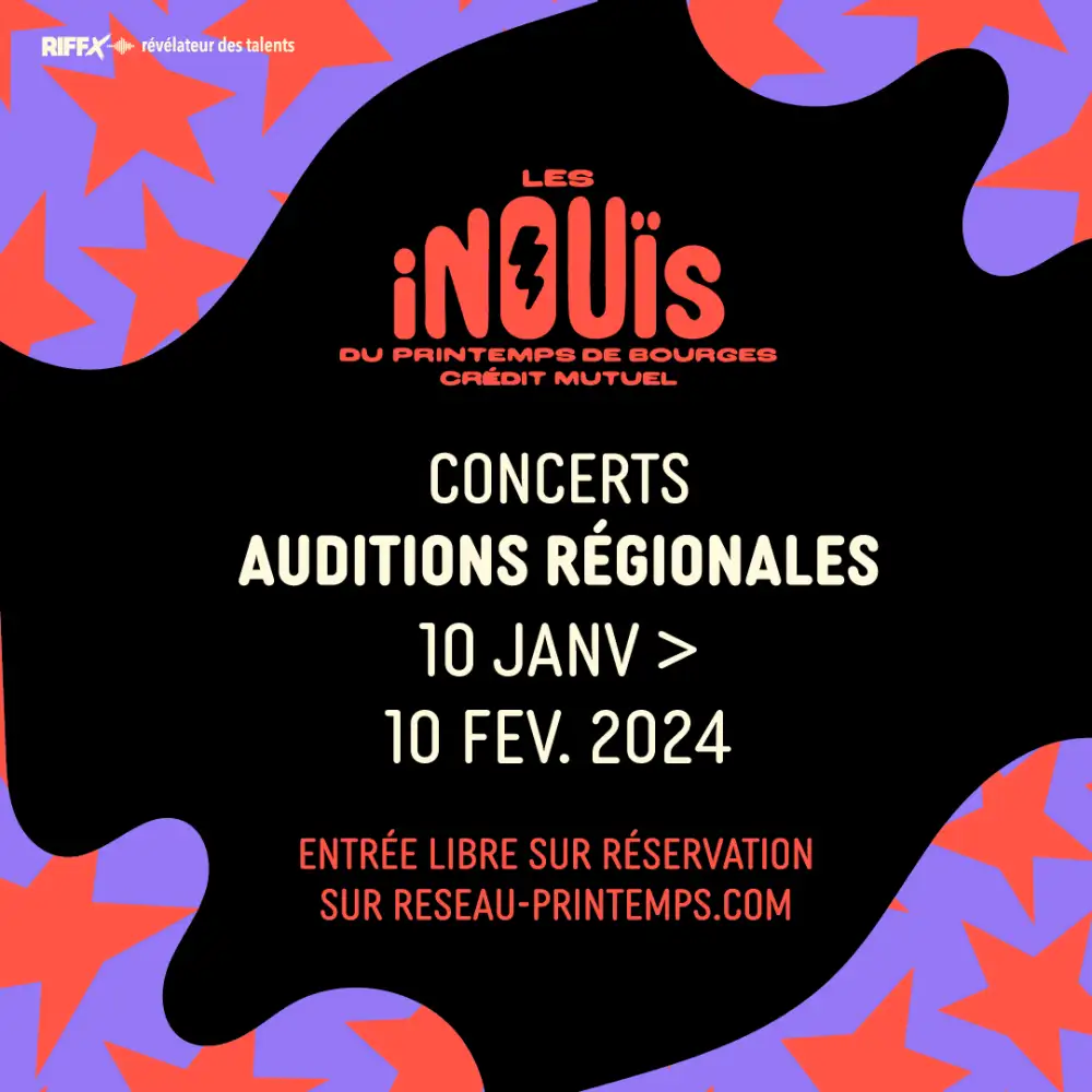 DU 10 JANVIER AU 10 FÉVRIER PROCHAIN, LES ARTISTES PRÉSÉLECTIONNÉ·ES SE PRODUIRONT SUR SCÈNE POUR TENTER DE FAIRE PARTIE DE LA SÉLECTION INOUÏS DU PRINTEMPS DE BOURGES CRÉDIT MUTUEL 2024 !