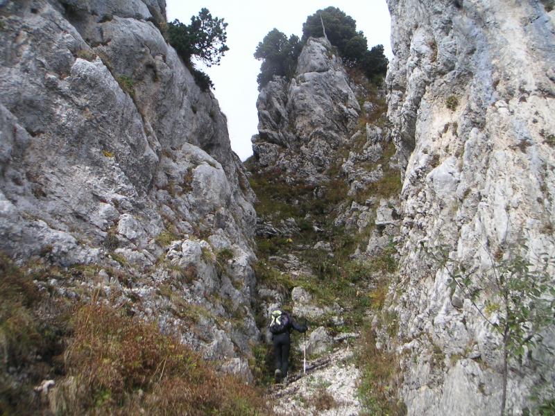 En sortie de passage, montée HORS PISTE pour rejoindre le sangle de Bellefont puis une nouvelle fois HORS SENTIER pour atteindre le couloir final et son pas d'escalade de 3m (en 3 sup)