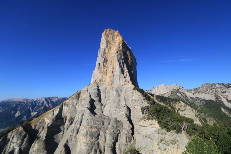 Départ du village pittoresque de Trézanne. Montée dans les forêts automnales dans les contreforts orientaux du Mont Aiguille. Vue impressionnante sur le pilier Est du Mont Aiguille depuis le rocher de Pansaret.
